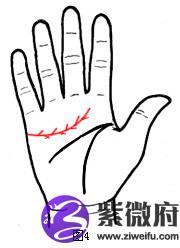这种万人迷的女性,手一般都是有特点的。整个手型以绵软柔长者为多,十指向手背翘起,能翘成30度以上的弧形,而手掌心又极富弹性。最显著特点的是:感情线上有许多条细纹支线往上(冲手指方向)伸出(如图4),但如果此种类型的女性,感情线不仅向上有细纹,向下(掌心)亦有细纹,而且交错纵横,方向不定,那么表示她的社交能力虽然很强,异性朋友多,但容易卷入多角情感漩涡之中,有时不能自拔而惹出事端,所以要有警惕才是。
