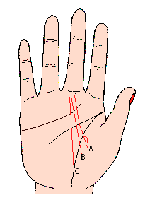 命运线起自金星丘,表示靠异性或亲属的提拔来开运(记号B),但此线短得达不到头脑线,即使受了其恩惠,也只有一时的。