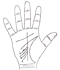 3·太阳线若停止于理智线(如图C);或停止于感情线(如图D):则是不令之相,前者表示由于决策的错误,使得好运中止;后者表示由于感情用事,理智蒙蔽,而使得好运中止。