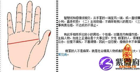 感情线与智慧线合并成一条线,横切了手掌,谓之断掌。古书有云:男儿断掌千斤两,女子断掌过房养。断掌的人,性格倔强、固执。若加上手硬,顽固到极点。从好处看,只要认定目标,纵有万般困难,也会勇往直前;但从坏处看,性格偏执,如果做错,一错错到底,宁死不悔。