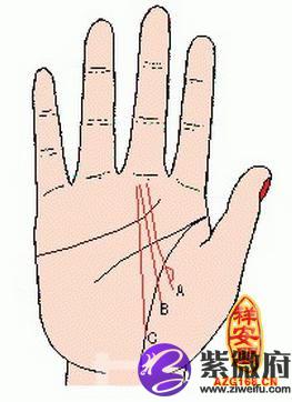 婚姻线的分岔,断裂,都表示婚姻的暗礁,夫妻之间往往容易发生误会,而引起意见分歧,情绪的不满,以及性生活的不调和,或第三者的介入。