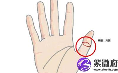 位于大拇指第二节手掌虎口处的横指节纹呈几个眼状纹便是佛眼纹。位于大拇指前关节处眼状指节纹则称为孔子目纹。意义同孔子目纹,代表此人聪明,智慧高。
