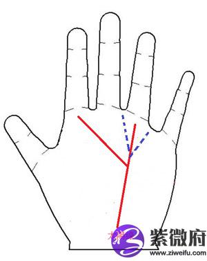 女性有此种相是女强人,虽可代夫兴家,却也是夺夫权。嫁给运势较弱会听妳话的的乖乖牌老公,是避免婚姻出问题较佳的方式。另外,若长出的支纹,像图中蓝色虚线伸到指缝中,则老年孤独无依。