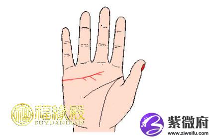 解读:这是比较典型的双鸟离飞之势。本来感情线上出现小的枝丫是爱的萌芽,是桃花。但这对于爱情的离合也有明显的影响。这个情况也意味着相恋的人或伴侣可能出现中途分离的情况。有这种情况的人可能在感情发展的过程中出现断档,可能未必会同自己的第一个恋人成婚(包括暗恋和柏拉图),也可能是离婚或有吵架分居的危险。总之,中途分离的情况可能比较明显,最好能够善加把握。