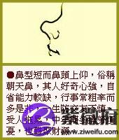 露灶鼻又叫朝天鼻,其特征是鼻孔朝上,而无托,山根缺陷有纹,鼻头高耸、鼻孔大、鼻孔外露、鼻柱长,平视看过去,就能看到鼻孔。