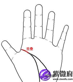 生命线和智慧线重叠约2cm,智慧线长度到达小指者是吉相,精神稳定又设想周到,加上工作态度踏实,有奋斗精神,能在不断努力下有所收穫。重叠若不到1cm或超过2cm太多,个性流于谨慎,过度的神经过敏,甚至消极保守,反而常常丧失了大好时机,须主动培养掌握机会的能力和决断力,促使人生往好的方向开花结果。