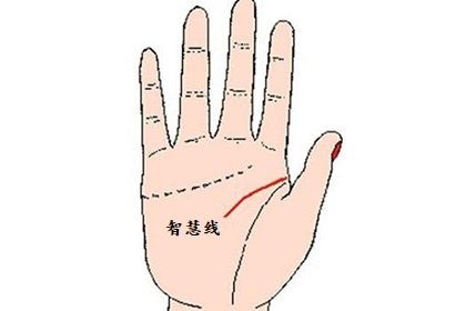 手相智慧线图解分析:智慧线上升的人想象力丰富,不过常常是空思妄想,而且相当任性。反之,因神经过敏而容易受到外界的诱惑。智慧线断开一上一下的人有优柔寡断的倾向!