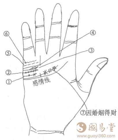 7.婚姻线尾部出现十字纹、米字线、口字纹、星纹,主婚后因婚姻而得财。