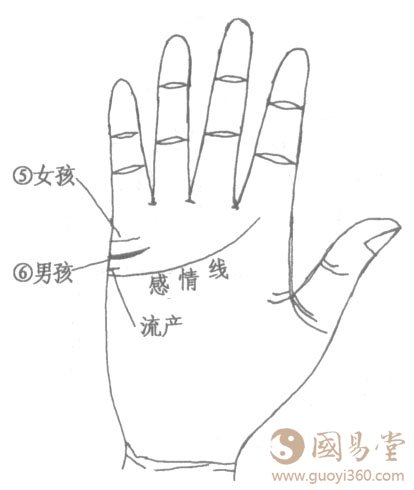 6.婚姻线根部线细、平直、清淡,再看人中开坡,嘴角、眼角下垂,面相子女宫发青白色,必生女孩,百发百中。