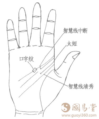 1.智慧线短者,一生命运坎坷、短命、思想不健全。(结合其他纹线而断)
